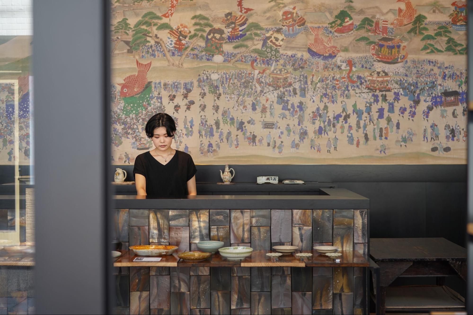 この「Arukara/歩唐」のツーリズムサービス窓口の商業複合施設「KARAE:カラエ」。唐津の玄関口に位置するこの施設のインフォメーションは、やきものギャラリーにもなっていて、「唐津くんち」の絵巻図と300枚もの黒唐津の陶板からなるカウンタ―でお客様を迎えます。ギャラリーの他、映画館、カフェレストラン、シェアオフィスなどが入居する話題のニューローカルスポットです。
